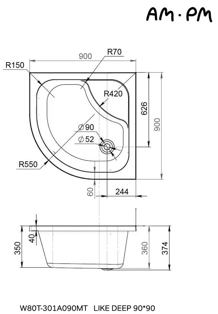 Душевой поддон AM.PM Like W80T-301A090MT 90х90 см, глубокий, с сифоном