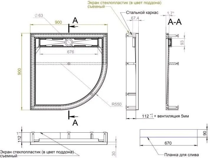 Декоративная накладка слива;Душевой поддон Aquanet Stone Lite;Панель для поддона;Сварной по периметру каркас с 5-ю усиленными точками опоры;Сифон с гидрозатвором