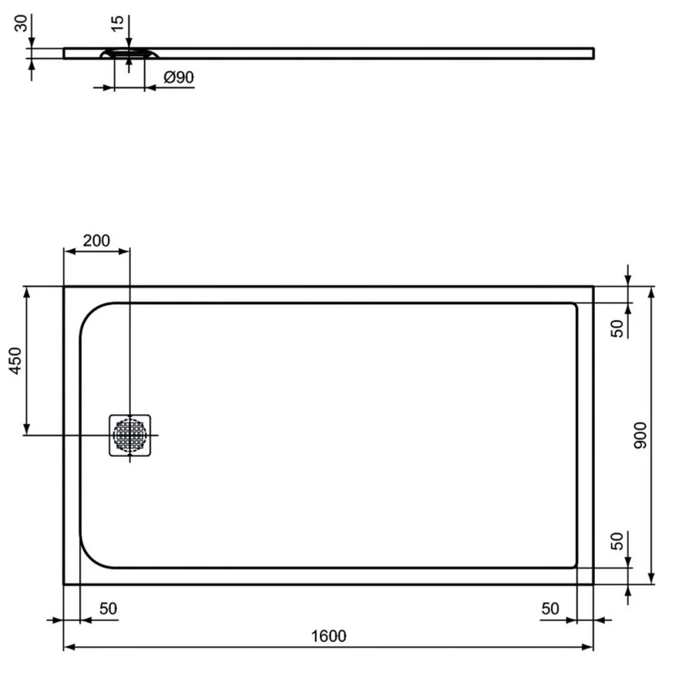 ULTRAFLAT S Прямоугольный душевой поддон 160X90 см. Декоративная прямоугольная накладка слива из нержавеющей стали в комплекте; ножки K936467 и система слива K936367 заказываются дополнительно