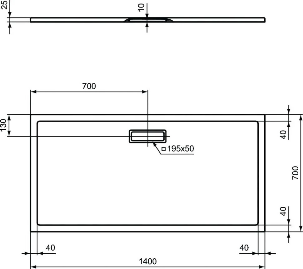 ULTRAFLAT NEW Ультратонкий акриловый прямоугольный душевой поддон 1400x700x25 мм. Для напольной или встраиваемой установки. Сифон с декоративной прямоугольной хромированной крышкой (T4493AA) заказывается дополнительно