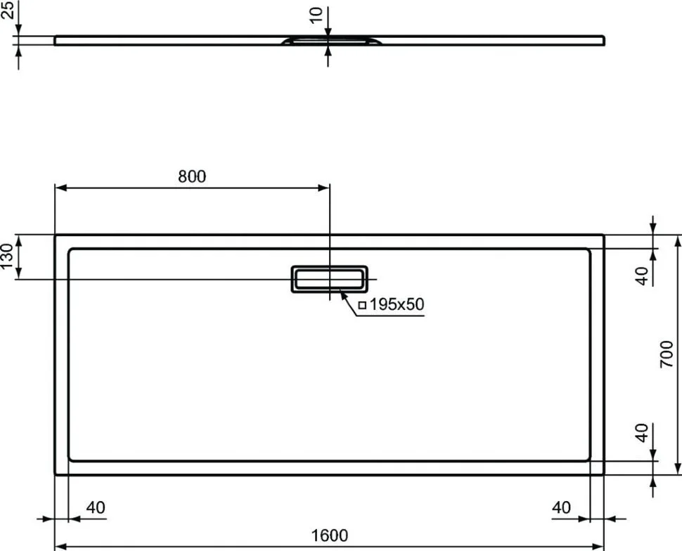 ULTRAFLAT NEW Ультратонкий акриловый прямоугольный душевой поддон 1600x700x25 мм. Для напольной или встраиваемой установки. Сифон с декоративной прямоугольной хромированной крышкой (T4493AA) заказывается дополнительно