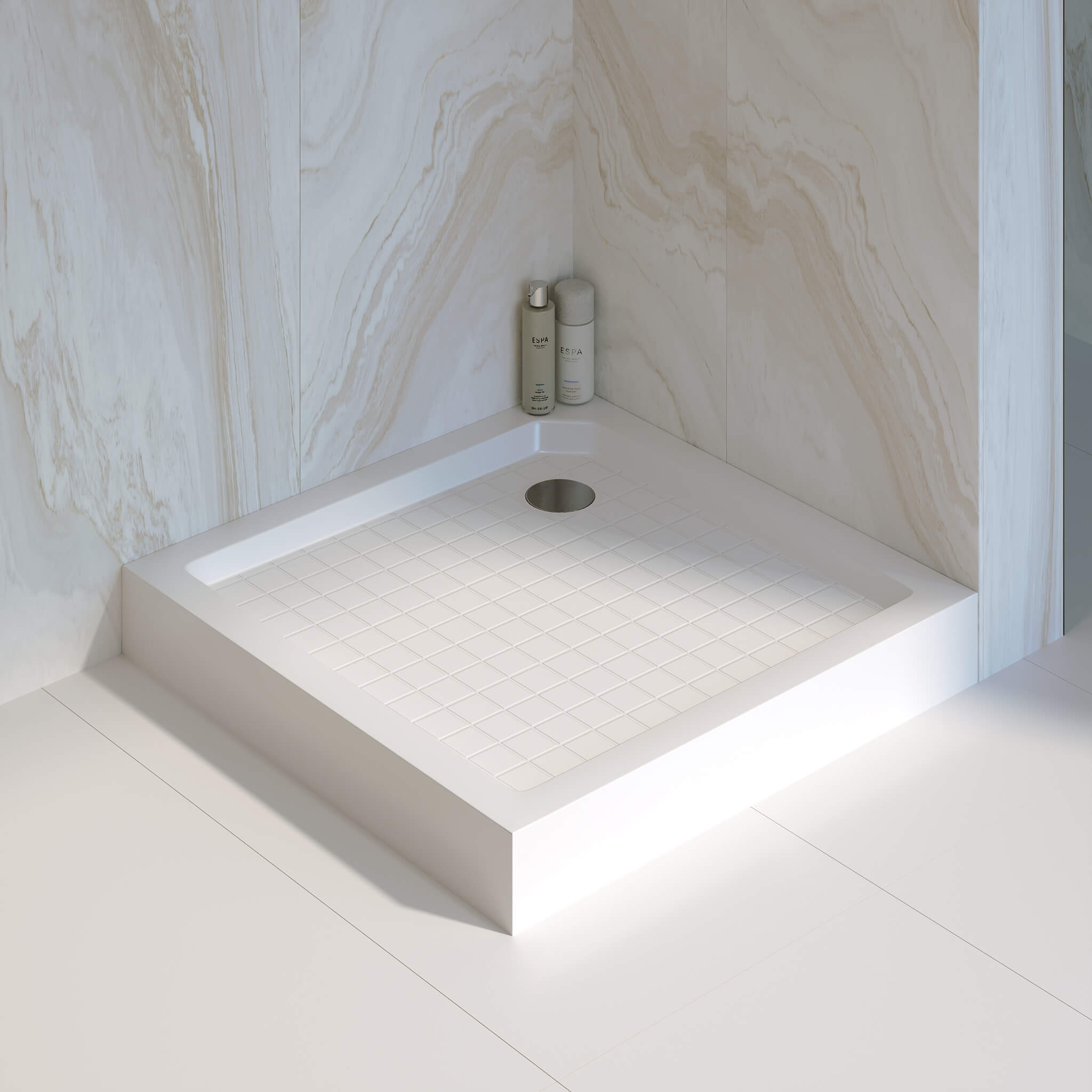 SMC - стеклопластик или стеклокомпозит. Поддоны производятся на высокоточном оборудовании под воздействием большого давления и высокой температуры. В результате получаются изделия по твердости поверхности не уступающие закалённому стеклу, а волокнистая структура материала и специальная конструкция поддонов позволяет выдерживать значительные механические нагрузки. Низкая теплопроводность материала, такая же как у дерева, позволяет поддерживать комфортную температуру поверхности поддона в процессе использования.