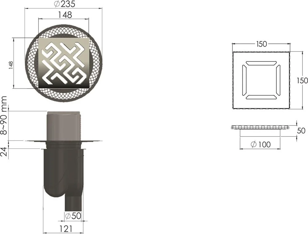 вертикальный выпуск D50/105 H50, пропускная способность 48л/мин, монтаж 360°