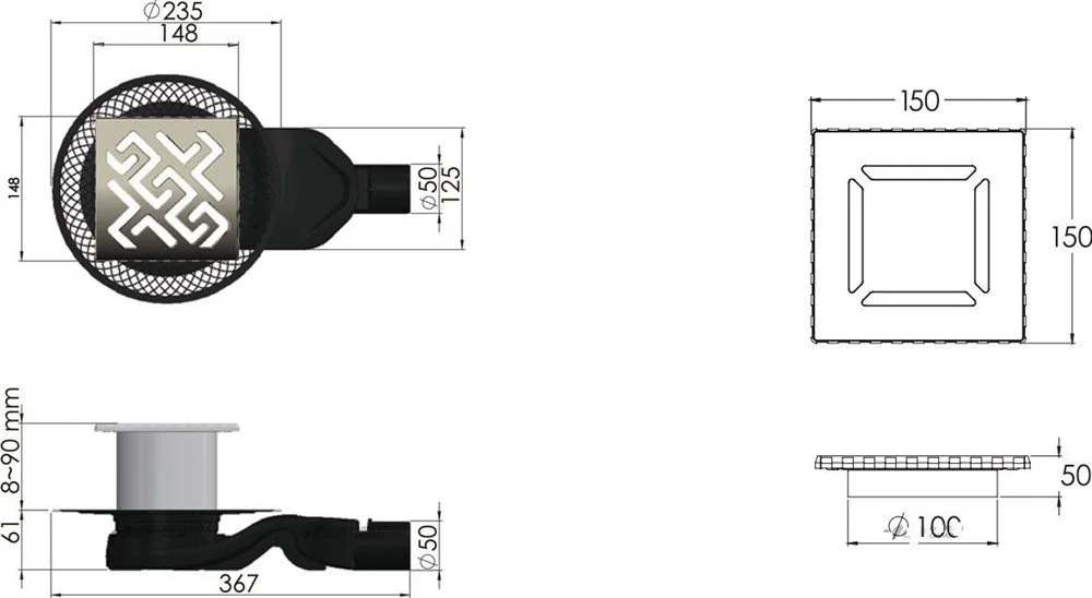 горизонтальный выпуск D50 H60, пропускная способность 42л/мин, монтаж 360°