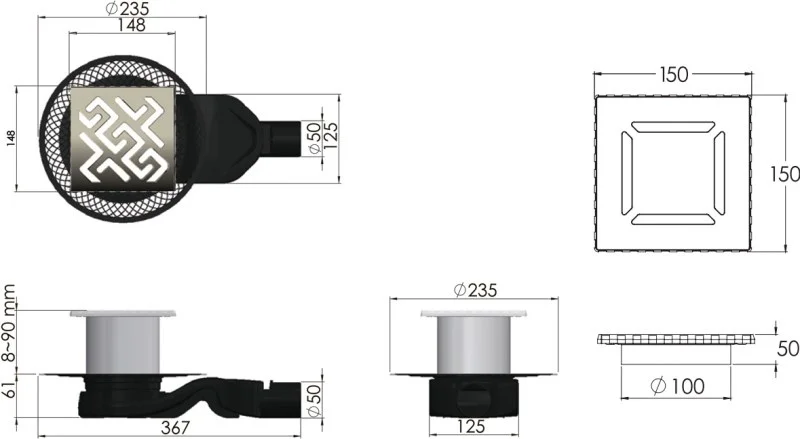 горизонтальный выпуск D50 H60, пропускная способность 42л/мин, монтаж 360°
