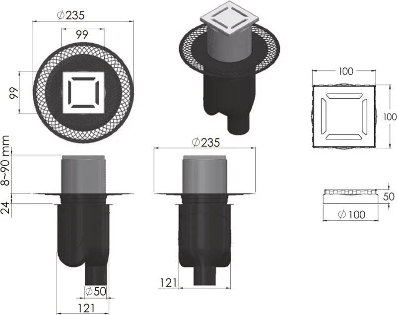 вертикальный выпуск D50/105 H50, пропускная способность 48л/мин, монтаж 360°