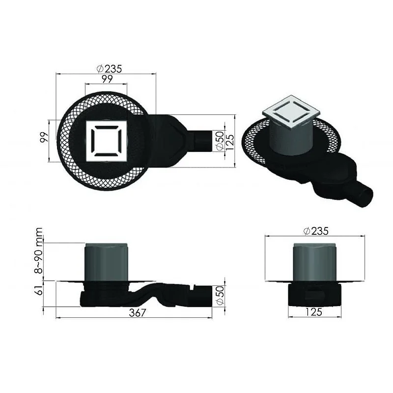 горизонтальный выпуск D50 H60, пропускная способность 42л/мин, монтаж 360°