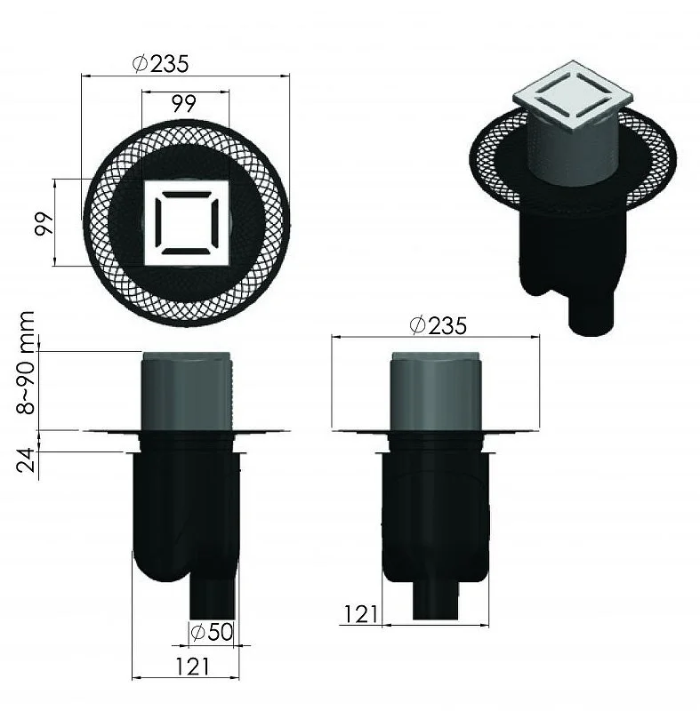 вертикальный выпуск D50/105 H50, пропускная способность 48л/мин, монтаж 360°
