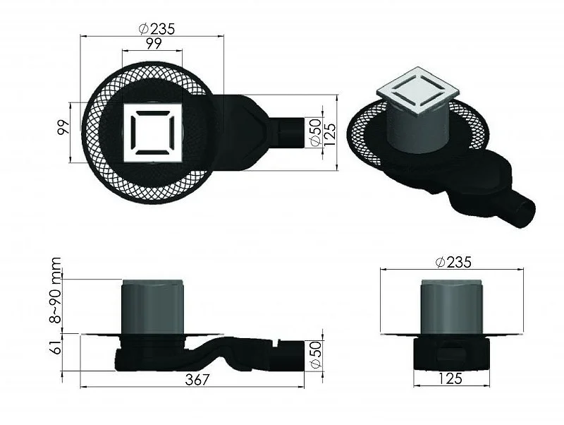 горизонтальный выпуск D50 H60, пропускная способность 42л/мин, монтаж 360°