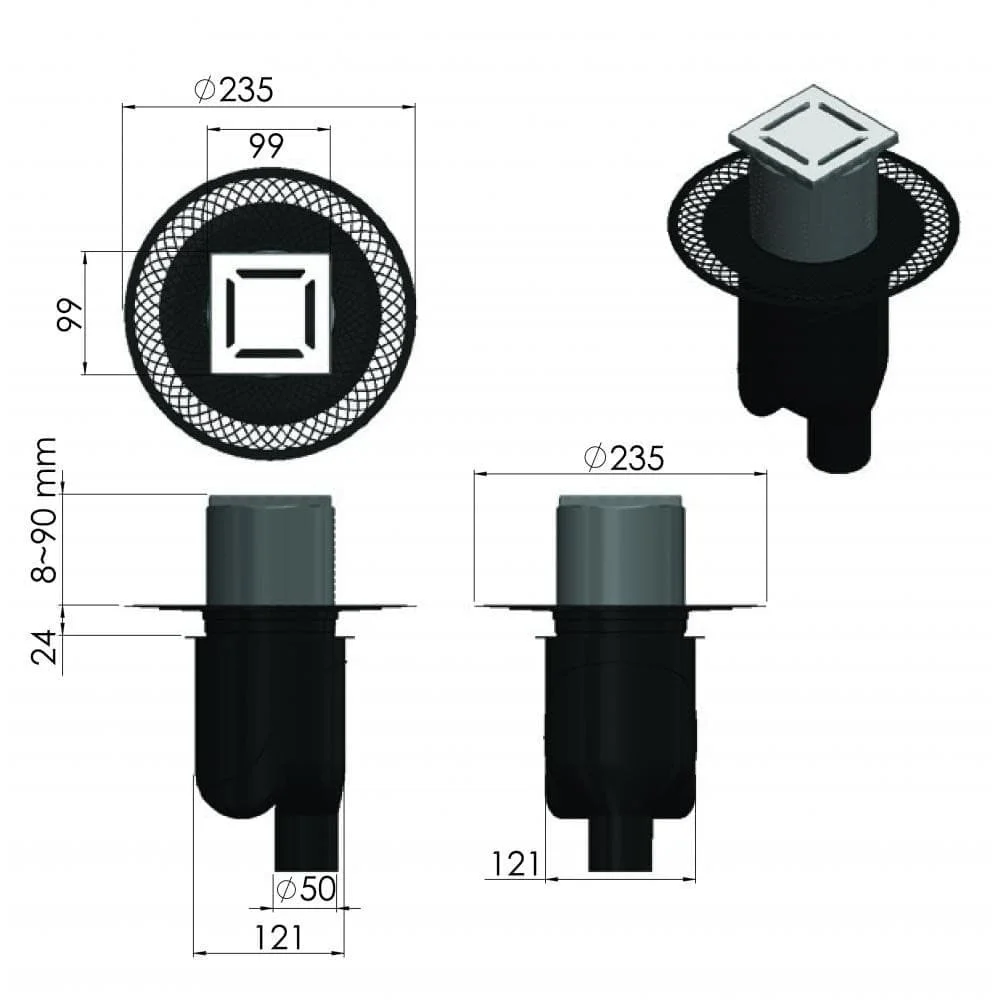 вертикальный выпуск D50/105 H50, пропускная способность 48л/мин, монтаж 360°