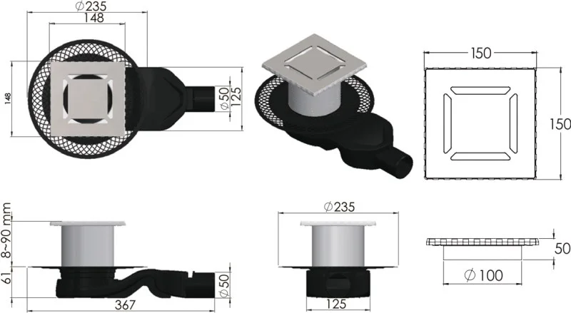 горизонтальный выпуск D50 H60, пропускная способность 42л/мин, монтаж 360°