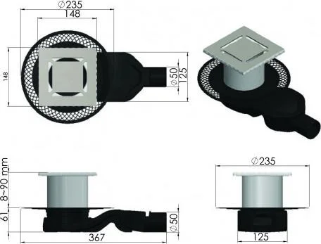 вертикальный выпуск D50/105 H50, пропускная способность 48л/мин, монтаж 360°