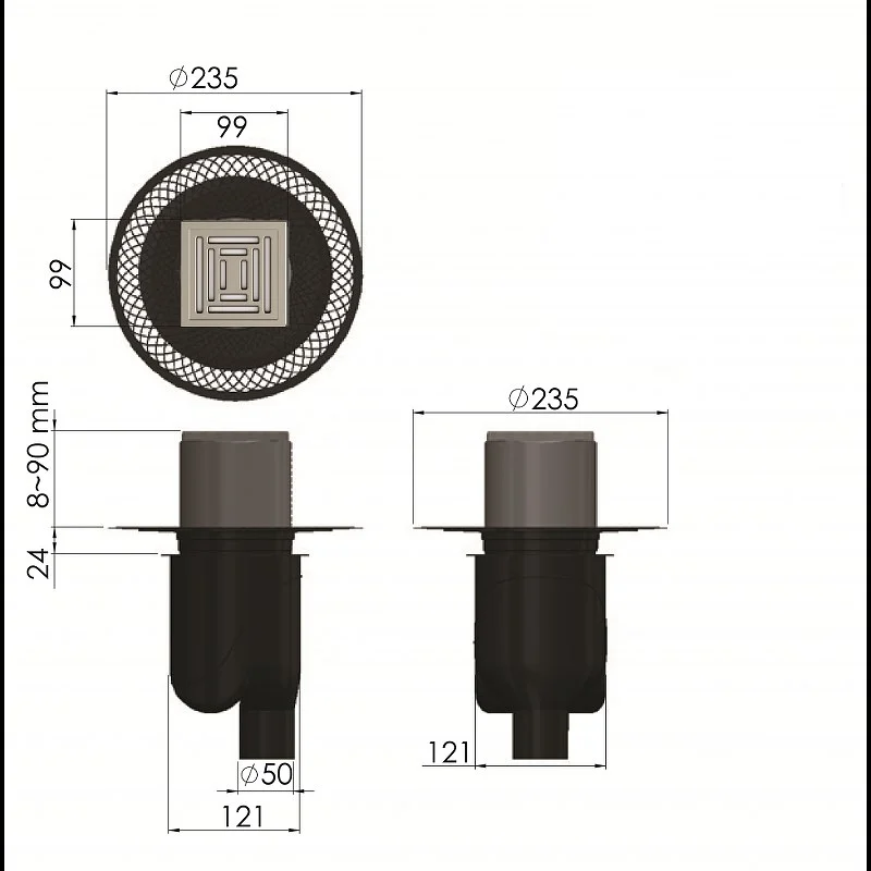 Решетка толщина 0,8мм, нержавеющая сталь AISI 304 Горловина трапа, пластик Фланец трапапа с переходником, РР Монтажная заглушка, PP Самопромывной S-образный сифон PP: вертикальный выпуск D50/105 H50, пропускная способность 48л/мин, монтаж 360° Монтажный ключ, пластик