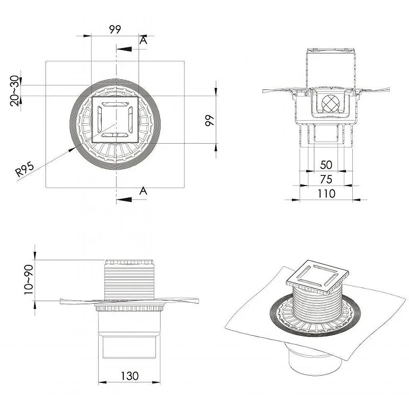 Душевой трап BERGES ZENTRUM Norma 100х100, матовый хром, выпуск D50/75/110 H74 вертикальный 090462