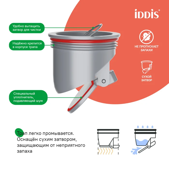 - Оснащен сухим затвором, защищающим от неприятного запаха даже после испарения воды в сифоне.