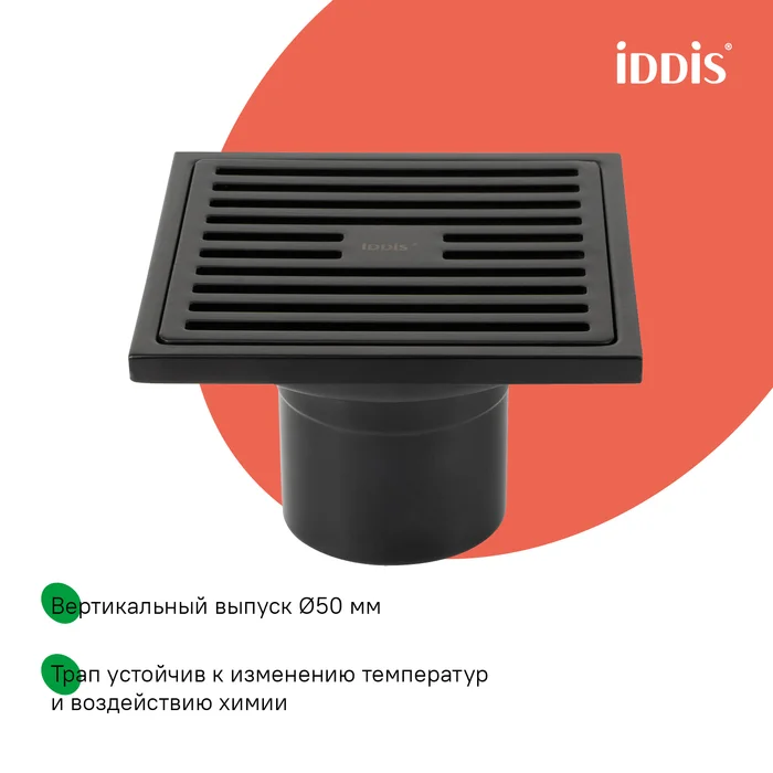 Душевой трап IDDIS® в матовом черном цвете с утяжеленной решеткой и вертикальным выпуском предназначен для отведения воды в канализацию из зоны принятия душа. Он заменит традиционные поддоны с бортиками, предлагая универсальный дизайн решетки и возможности для создания стильного интерьера ванной комнаты. Размер решетки — 10 x 10 см; подходит для плитки толщиной до 12 мм.