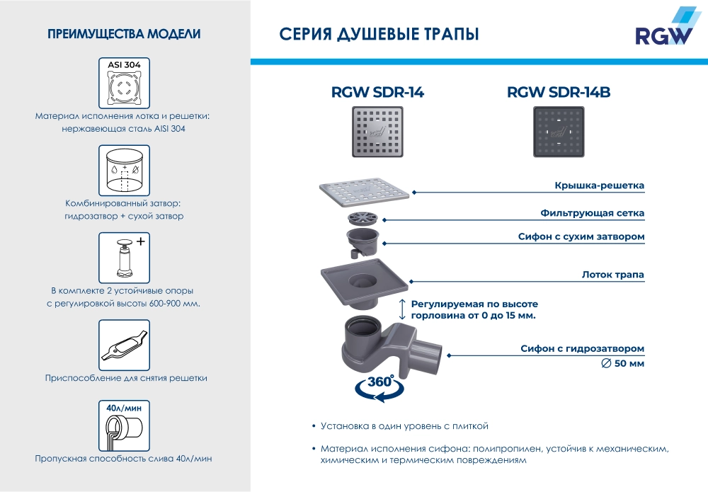 Купить Душевые трапы и лотки производства RGW (Германия), код товара: 211474 можно выгодно в Сантемо.ру: