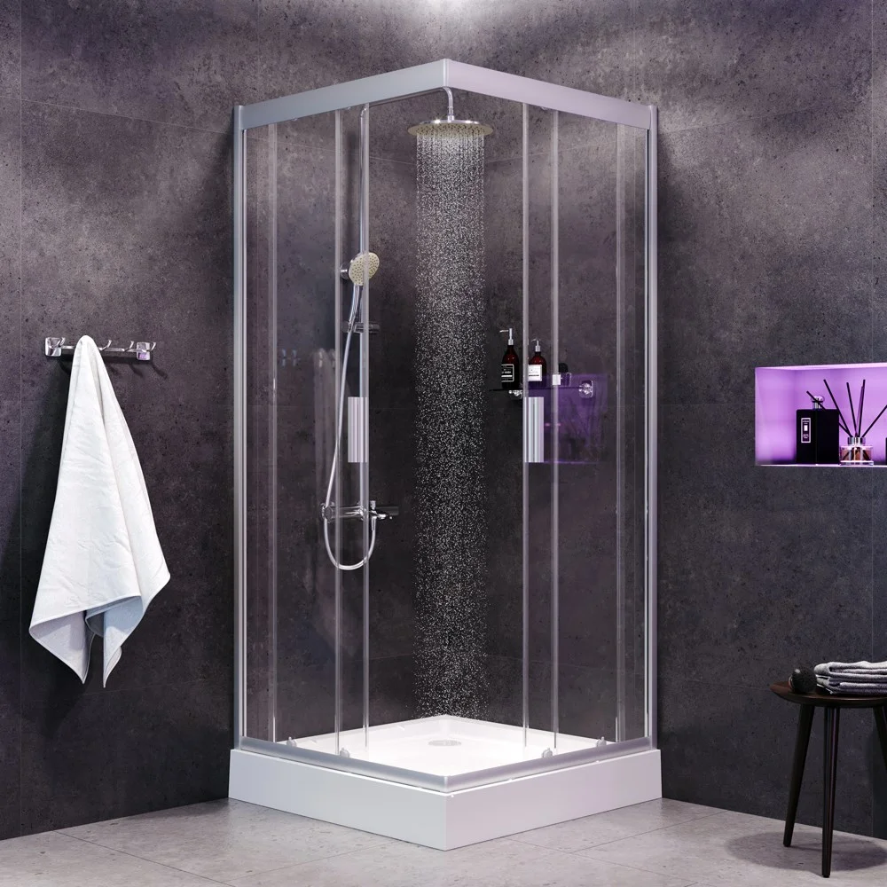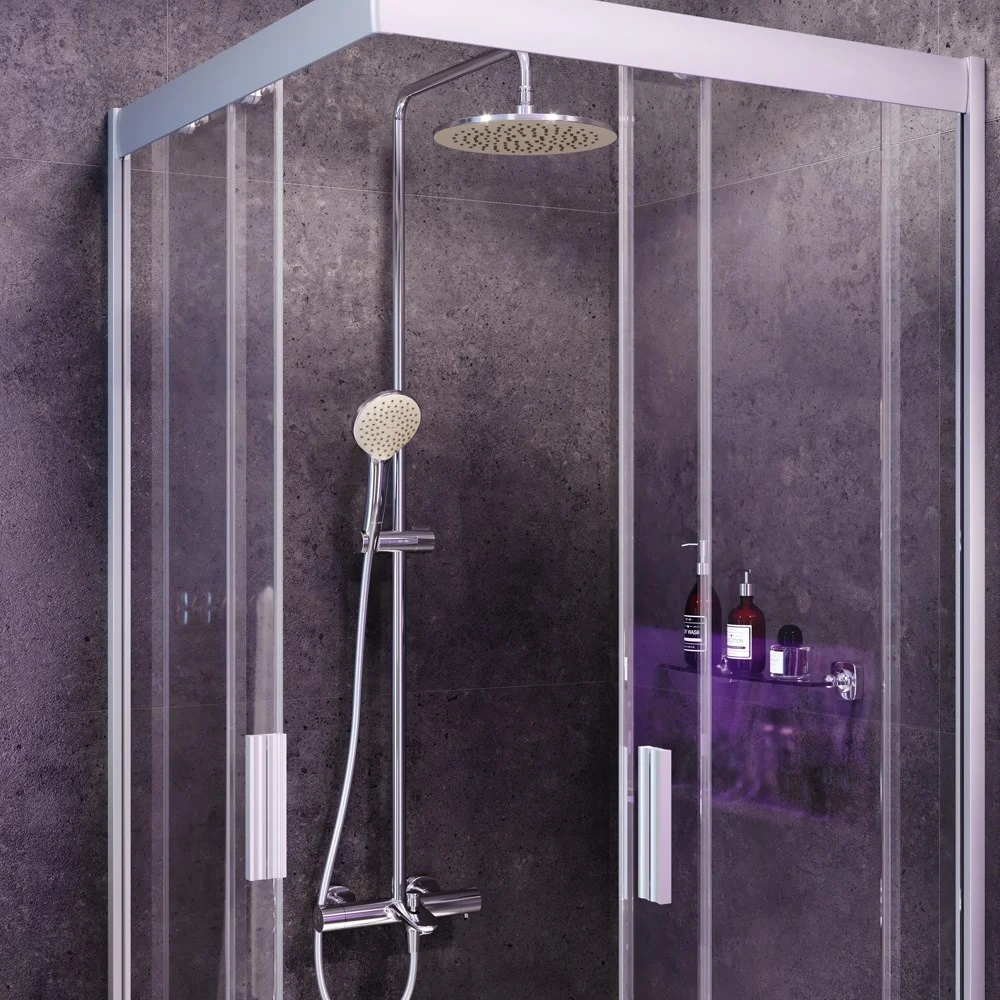 Душевой набор Gem идеален для тех кто в поиске компактного решения для своей ванной комнаты без ущерба функциональности. Квадратное душевое ограждение из прозрачного стекла в серебристом профиле комплектуется душевой системой с термостатом и верхним душем.
