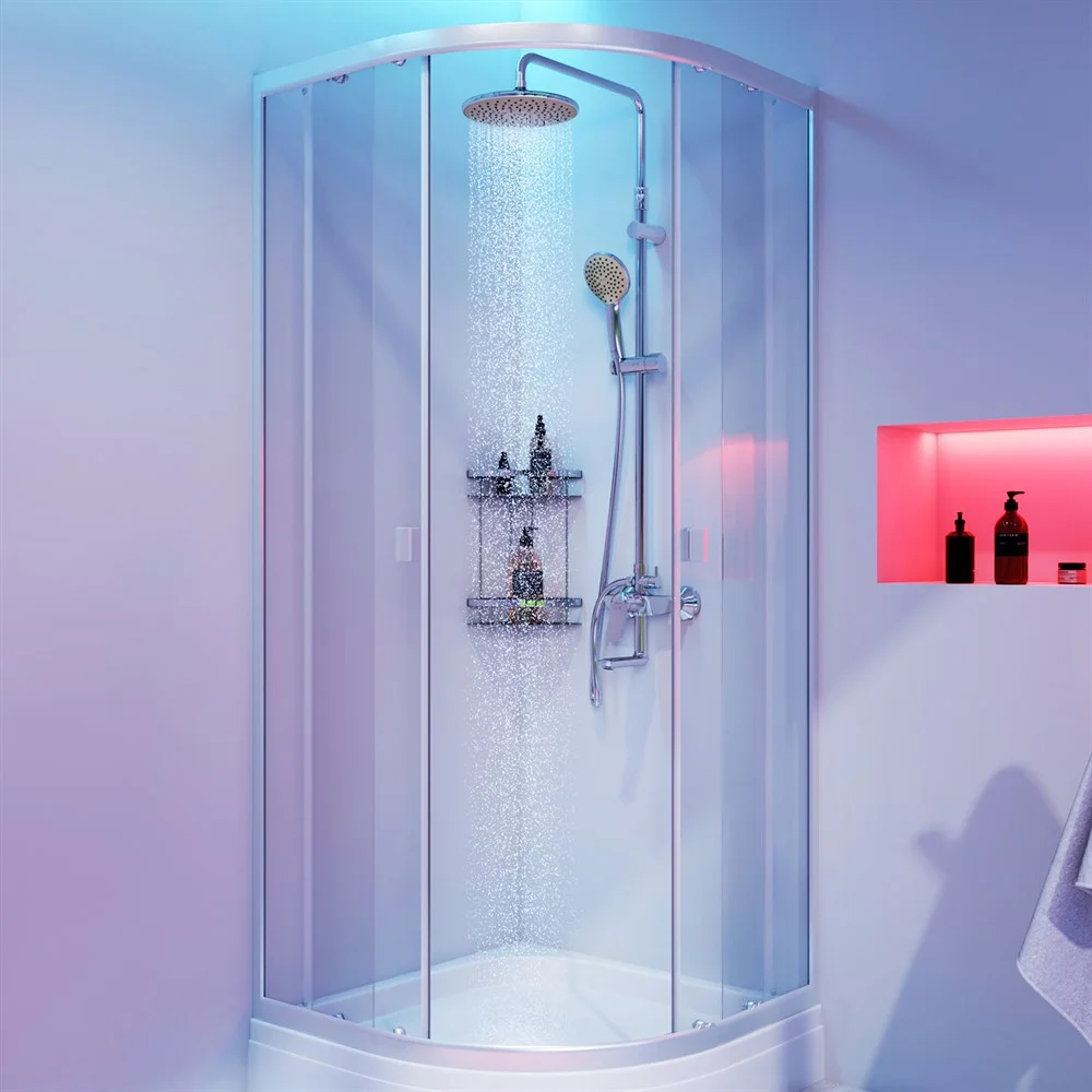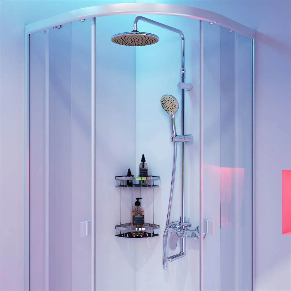 Душевой комплект для душа. Комплект создан с учетом основных потребностей: удобное расположение элементов комплекта возможность установки в небольших комнатах прочная конструкция. Готовое решение для ванной комнаты отличается своим размером высота душевого ограждения без учета поддона составляет 1800 мм. Такая высота предотвратит попадание капель воды за пределы душевого уголка. Противоскользящие покрытие акрилового поддона для безопасности. Душевая система с премиальным набором функций. Увеличенный диаметр леек ручного и тропического душа выполняют не только свою первоначальную функцию но и помогают привести мысли в порядок ранним утром или расслабиться перед сном. Телескопическая поворотная штанга регулируется по высоте в диапазоне от 1030 до 1460 мм поэтому вы сможете подстроить ее под свой рост. Профили душевого уголка сделаны из анодированного алюминия его главное свойство - высокая стойкость к влаге. Закаленные стекла толщиной 4 мм для полной уверенности в прочности конструкции.