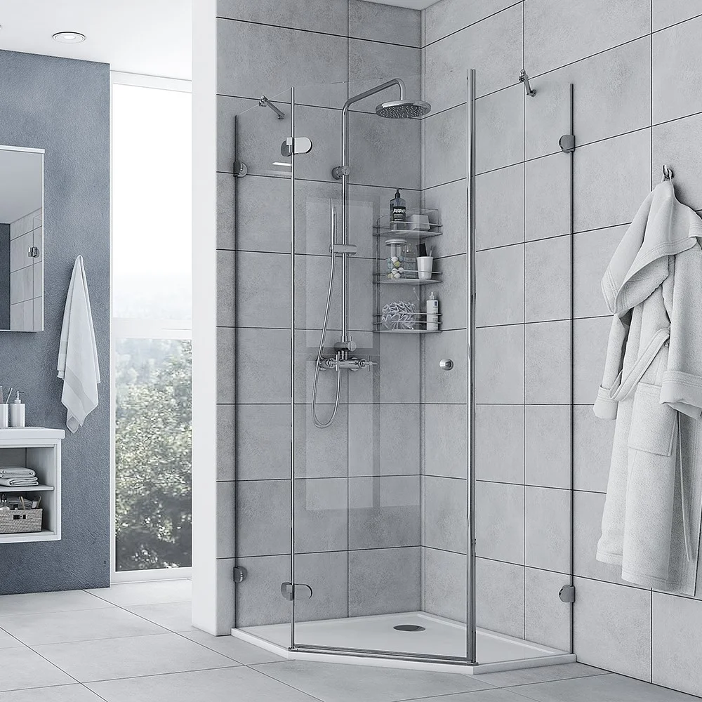 Душевое ограждение пятиугольное с открыванием двери наружу и подъемно-опускным механизмом. В левом исполнении. Уникальная модель с функцией безсаморезного монтажа. Бесцветное закаленное стекло, качество М1, толщина стенок 8 мм, толщина дверки 6 мм. Фурнитура хром блестящий.