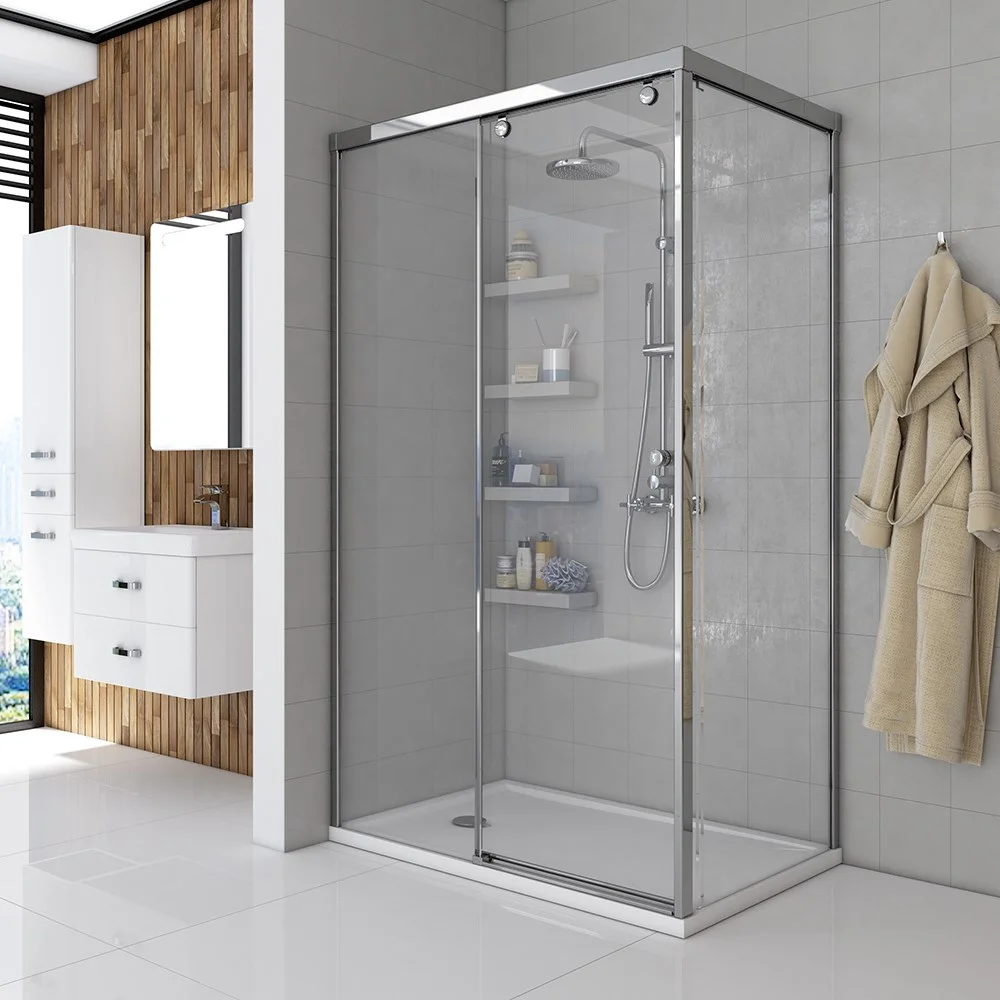 Душевое ограждение прямоугольной формы с раздвижной дверью на подвесных  роликах без нижнего профиля. В  левом исполнении. Ролики латунные, с подшипником и съемным механизмом. Уникальная модель с функцией безсаморезного монтажа.  Бесцветное закаленное стекло, качество М1, толщина стенок 8 мм, толщина дверки 6 мм.
