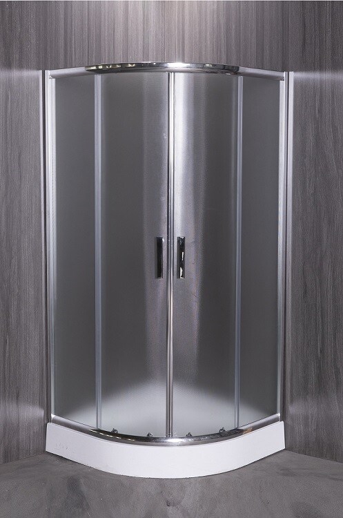 Уголок душевой. Низкий поддон; сифон с гидрозатвором; алюминиевый профиль, цвет: "глянцевый хром", стекло толщиной 5 мм, фактура: "мороз", двойные верхние ролики, регулировочный пристенный профиль 20мм. Стальная ручка.