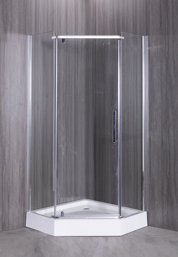 Уголок душевой. Низкий поддон; сифон с гидрозатвором; алюминиевый профиль, цвет: "глянцевый хром", стекло толщиной 6 мм, прозрачное, двойные верхние ролики, регулировочный пристенный профиль 20мм. Стальная ручка.