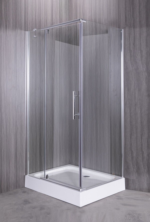 Уголок душевой. Низкий поддон; сифон с гидрозатвором; алюминиевый профиль, цвет: "глянцевый хром", стекло толщиной 6 мм, прозрачное, двойные верхние ролики, регулировочный пристенный профиль 20мм. Стальная ручка.