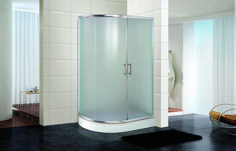 Уголок душевой. Низкий поддон; сифон с гидрозатвором; алюминиевый профиль, цвет: "глянцевый хром", стекло толщиной 5 мм, фактура: "мороз", двойные верхние ролики, регулировочный пристенный профиль 20мм. Стальная ручка.