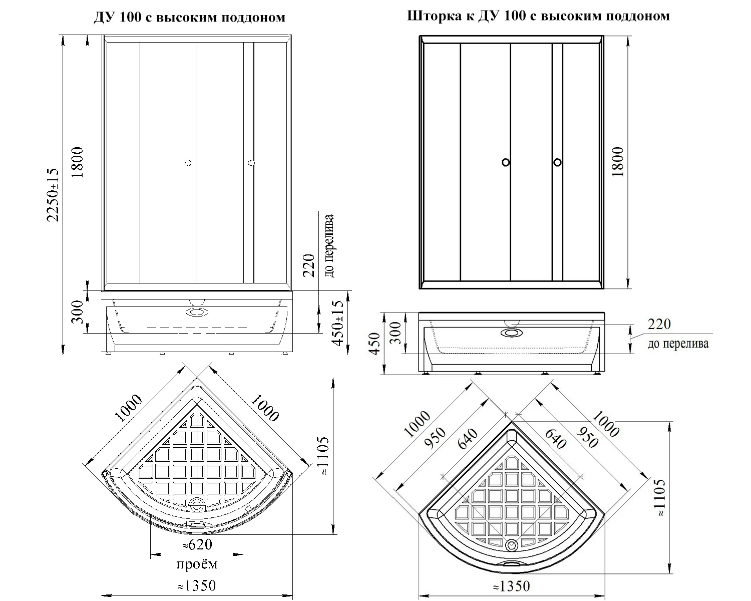 - Высокий поддон: Изготовлен из прочного сантехнического акрила, служит долго и легко чистится. Высокие борта сохраняют влагу внутри, защищая помещение о