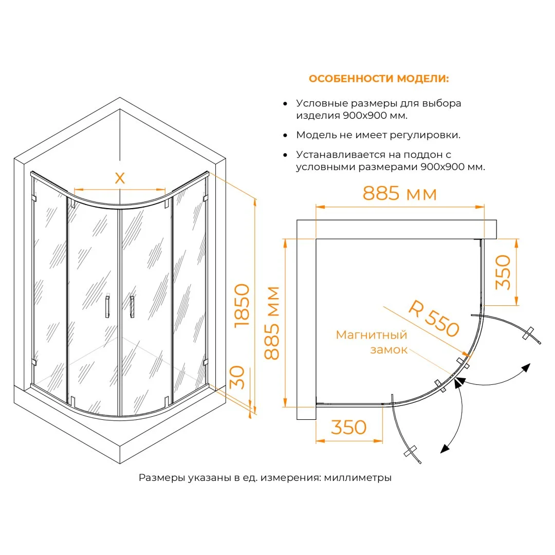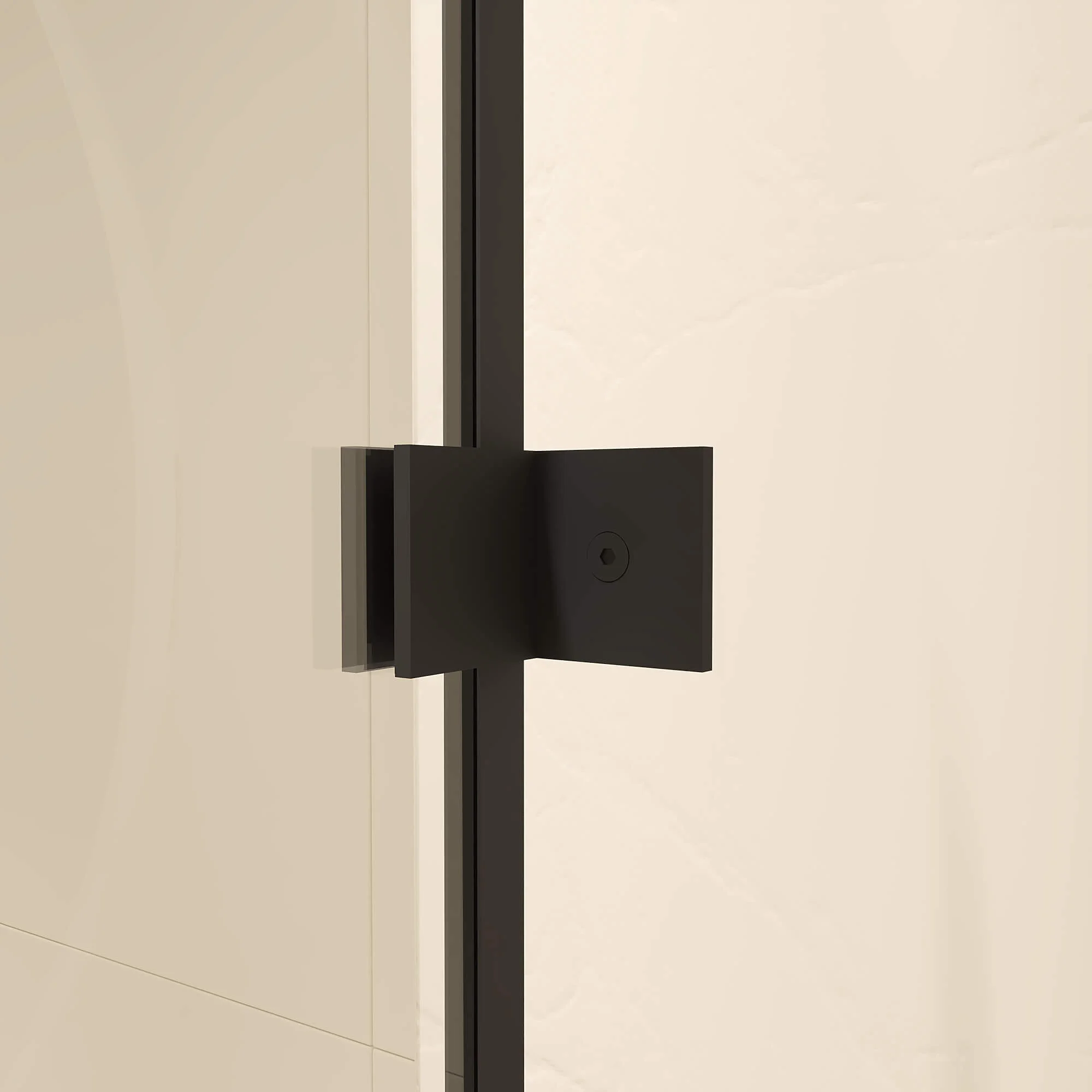 Модель представлена в чёрном исполнении профиля и фурнитуры, также обратите внимания, все уплотнители выполнены так же в чёрном цвете, что подчёркивает сдержанную стилистику душевых углов.