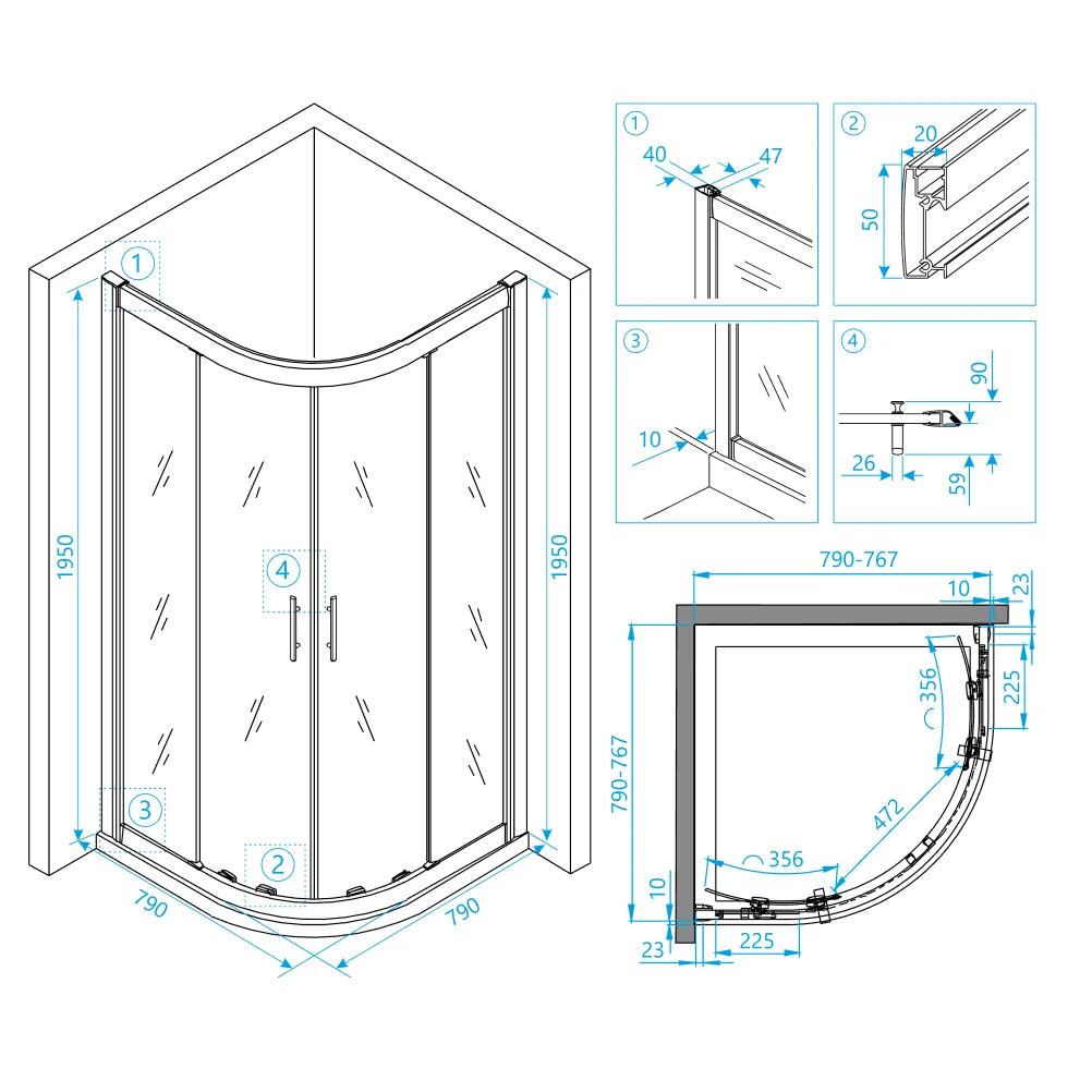 Цвет профиля хром создает дополнительный акцент на дизайн и визуально расширяет пространство комнаты. Высота душевого угла составляет 1950 мм, что обеспечивает комфортную высоту, и даже самые высокие люди смогут пользоваться душевым уголком без ощущения неудобства.