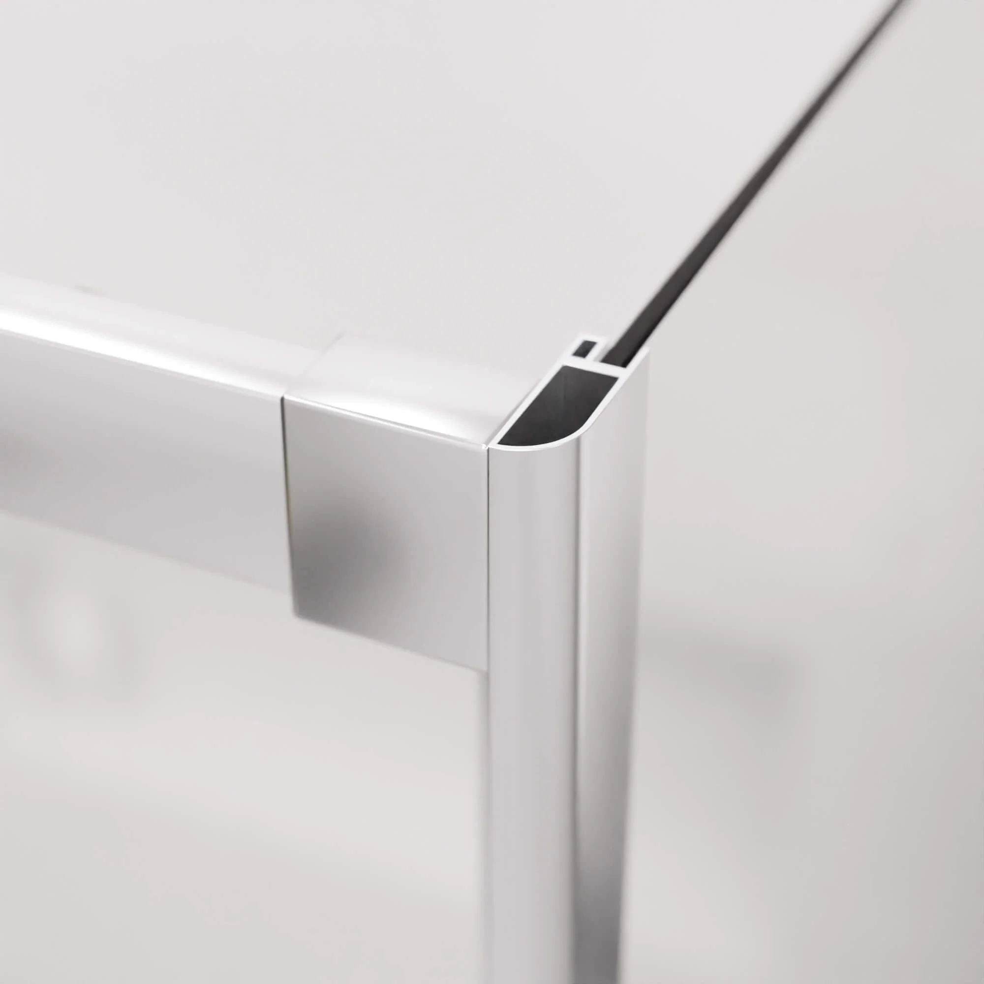 Цвет профиля хром, благодаря чему душевой уголок выглядит современным и эстетичным. Материал профиля - анодированный алюминий, который обеспечивает прочность и надежность конструкции. Роликовый подшипник позволяет дверям легко и безопасно скользить, а двойные регулируемые ролики обеспечивают плавное движение без шума и трения.