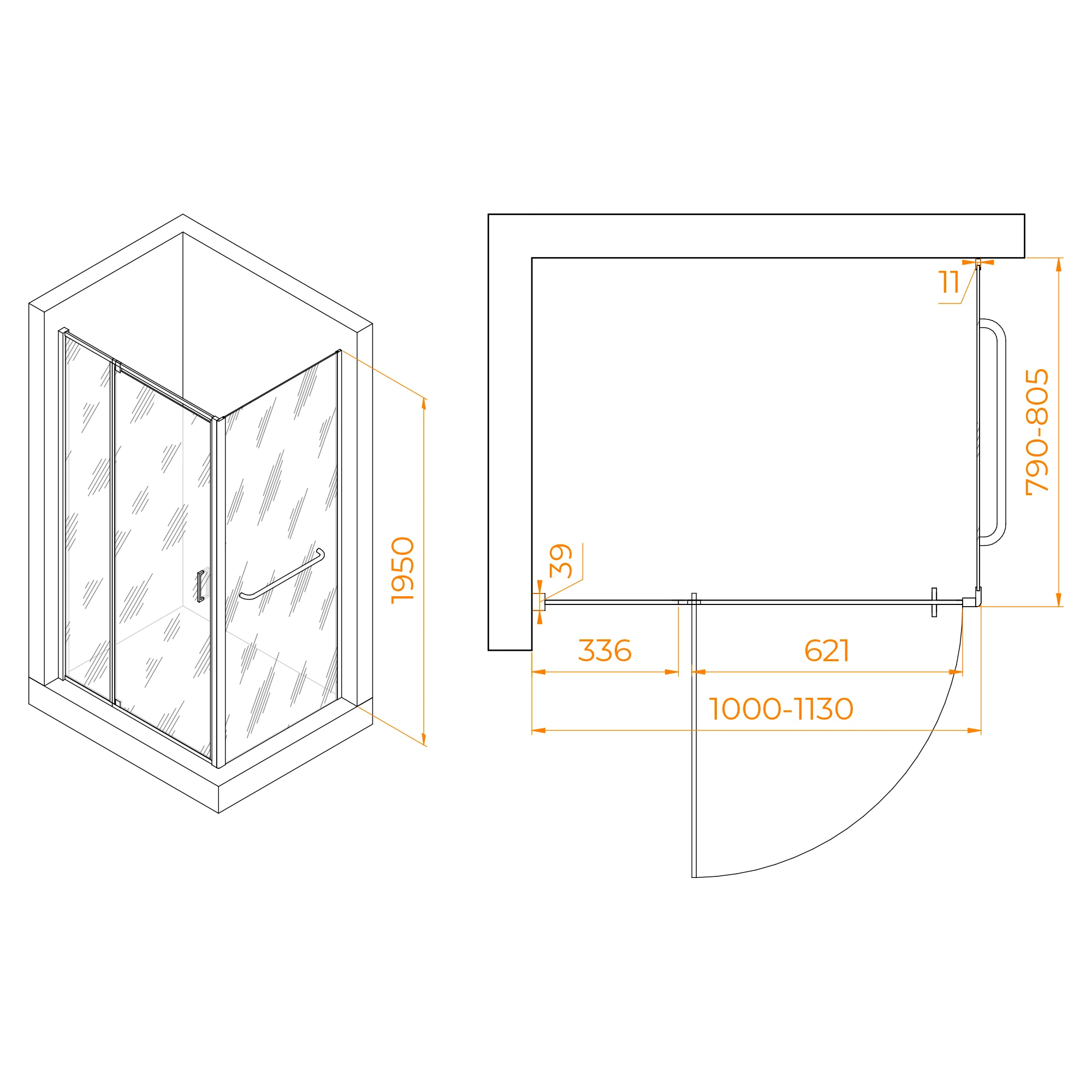 Форма душевого угла прямоугольная, что позволяет использовать его во многих вариантах планировки ванной комнаты. Высота душевого угла составляет 1950 мм, что обеспечивает комфортное пространство для принятия душа.