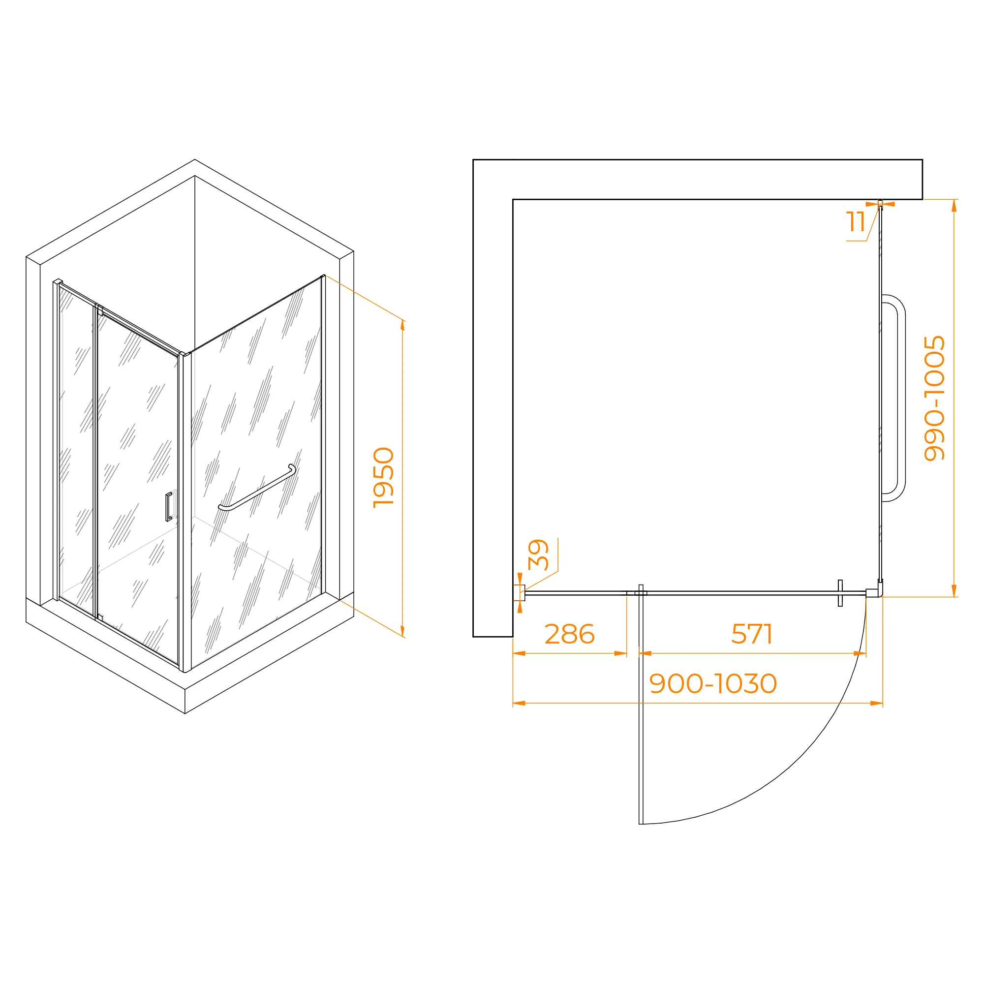 Форма душевого угла прямоугольная, что позволяет использовать его во многих вариантах планировки ванной комнаты. Высота душевого угла составляет 1950 мм, что обеспечивает комфортное пространство для принятия душа.