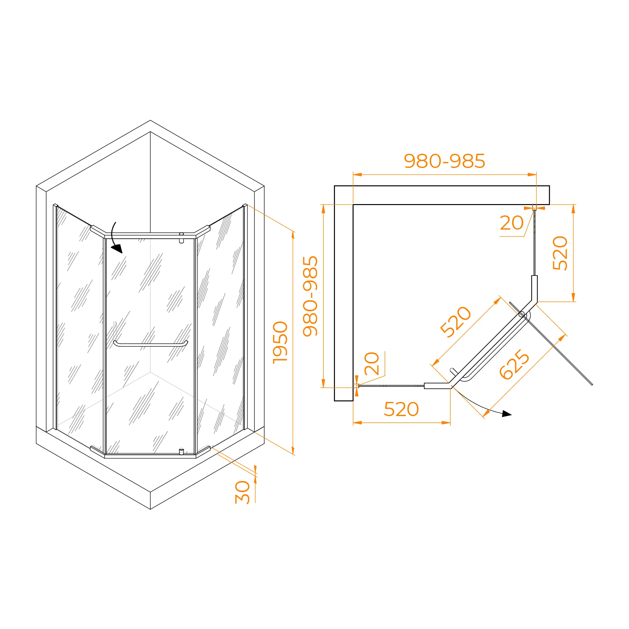 Стекло душевого уголка прозрачное, что создает ощущение простора и света. Оно также имеет покрытие анти капля Easy Clean, которое предотвращает образование водных разводов и легко чистится. Высота душевого угла составляет 1950 мм, что позволяет комфортно использовать его для людей разного роста.