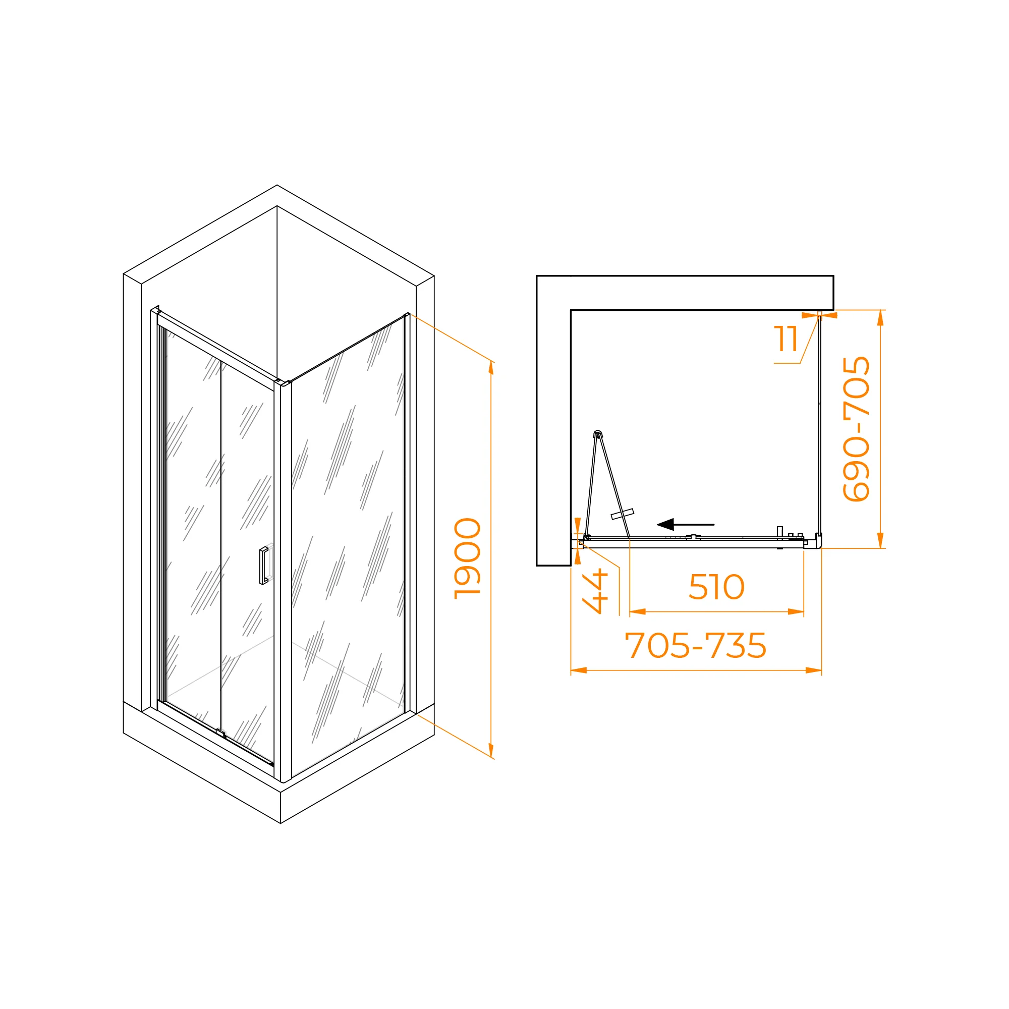 Высота душевого угла составляет 1900 мм, что позволит вам свободно принимать душ и не ощущать дискомфорта. Такие размеры подойдут как для высоких людей, так и для тех, кто предпочитает низкий душевой уголок.