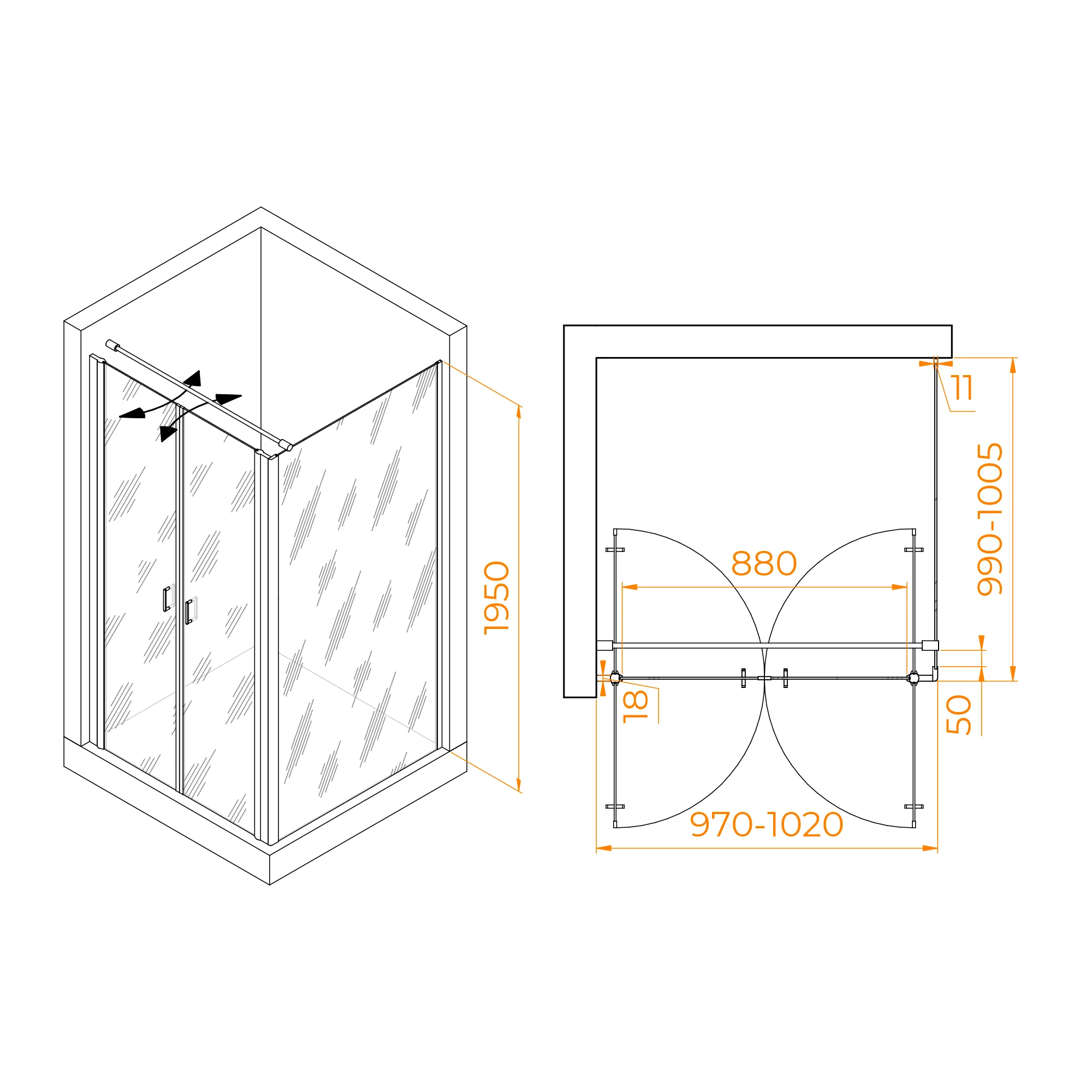 Высота душевого угла составляет 1950 мм, что делает его идеальным выбором для разных типов помещений. Независимо от высоты потолка, этот душевой угол легко вписывается в обстановку вашей ванной комнаты.
