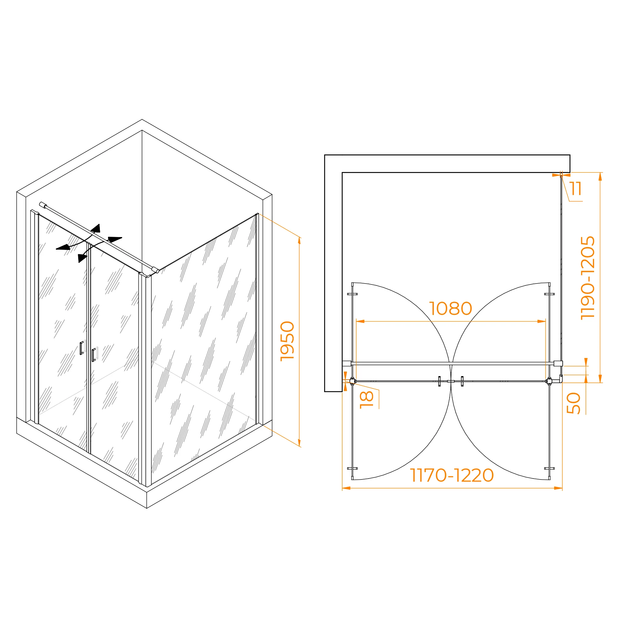 Высота душевого угла составляет 1950 мм, что делает его идеальным выбором для разных типов помещений. Независимо от высоты потолка, этот душевой угол легко вписывается в обстановку вашей ванной комнаты.