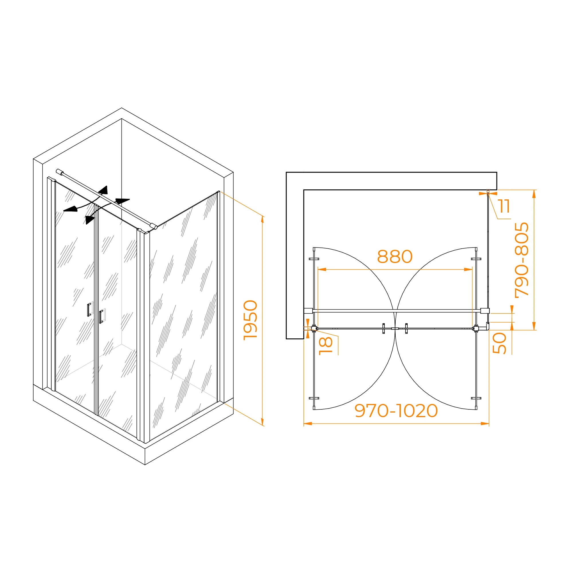 Высота душевого угла составляет 1950 мм, что делает его идеальным выбором для разных типов помещений. Независимо от высоты потолка, этот душевой угол легко вписывается в обстановку вашей ванной комнаты.
