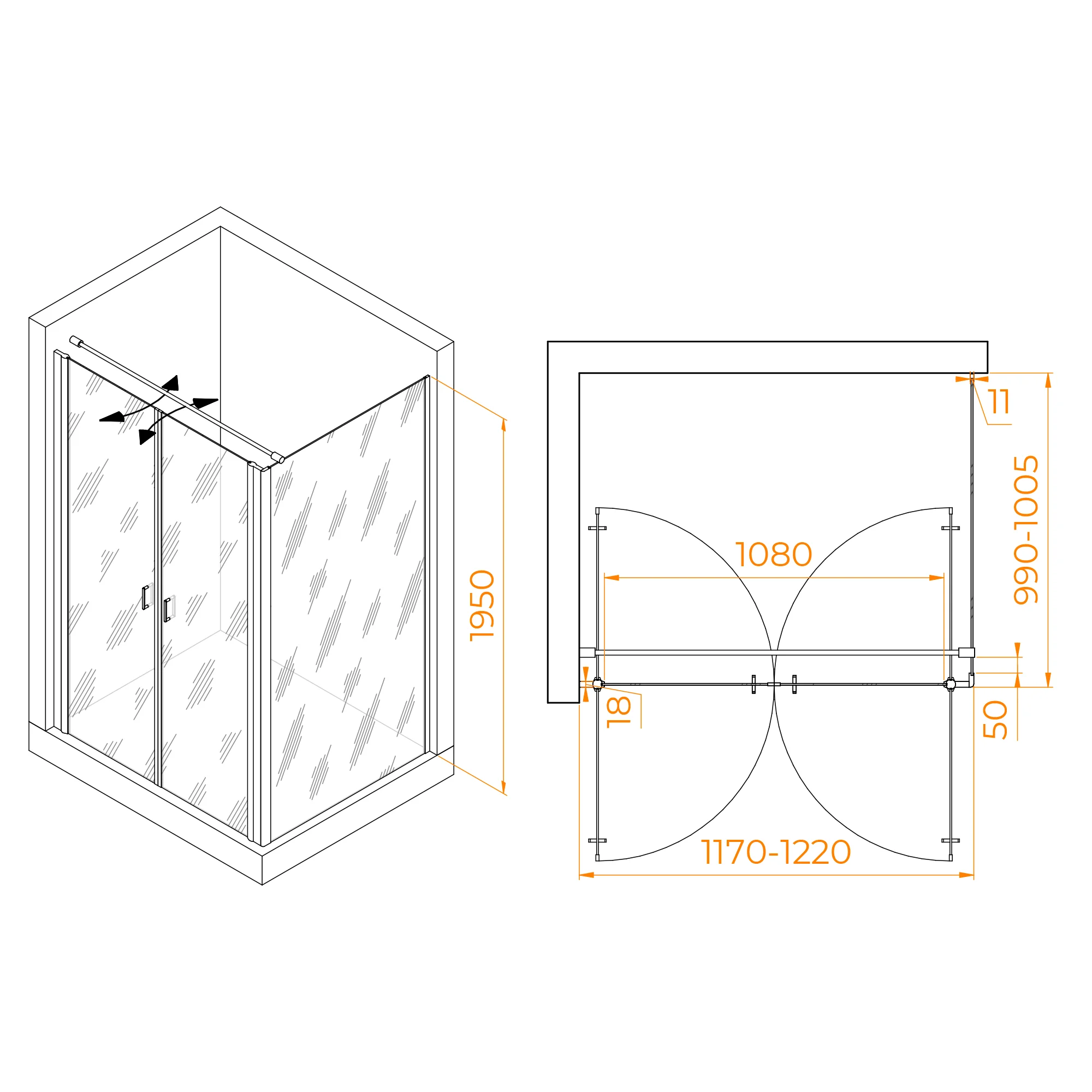 Высота душевого угла составляет 1950 мм, что делает его идеальным выбором для разных типов помещений. Независимо от высоты потолка, этот душевой угол легко вписывается в обстановку вашей ванной комнаты.