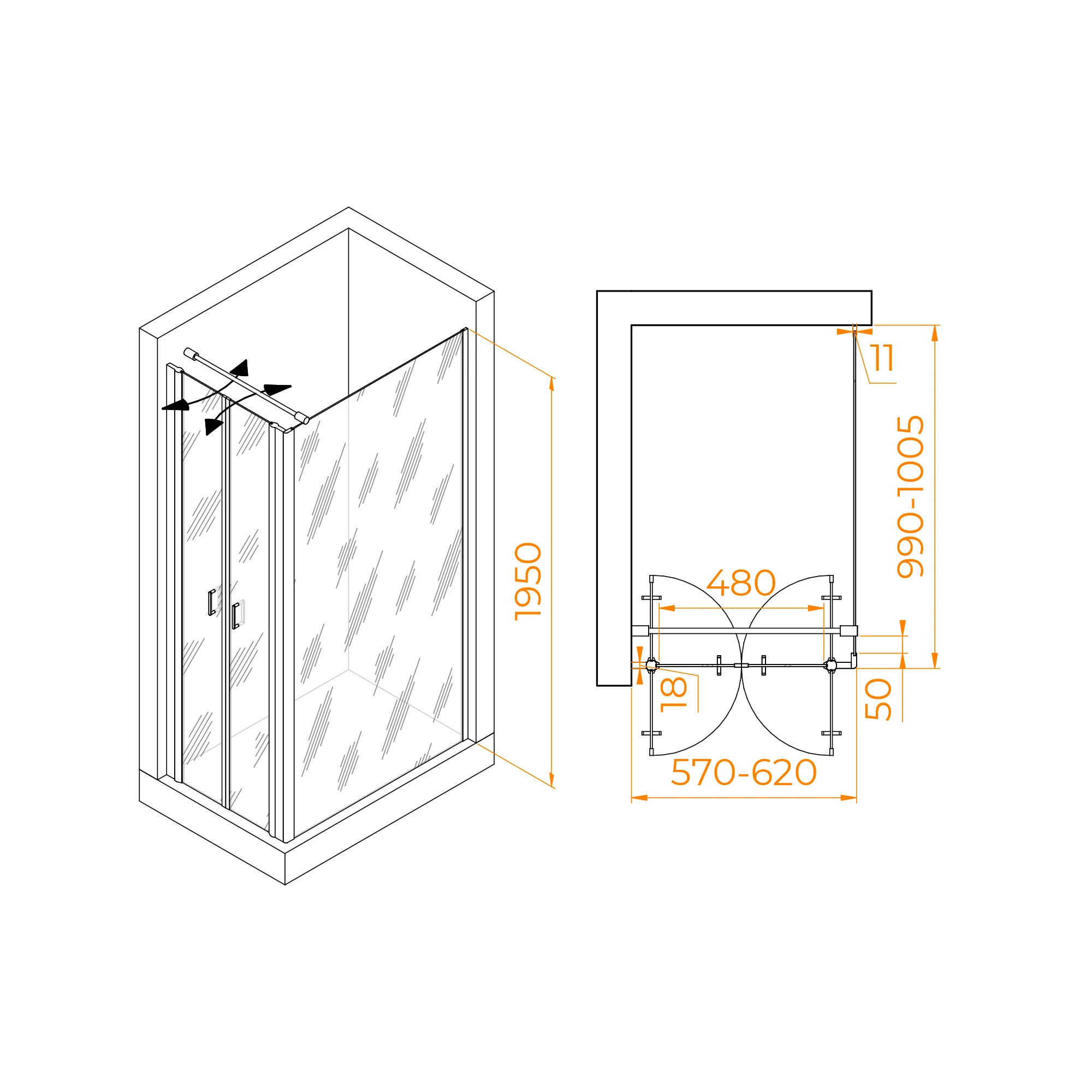 Высота душевого угла составляет 1950 мм, что делает его идеальным выбором для разных типов помещений. Независимо от высоты потолка, этот душевой угол легко вписывается в обстановку вашей ванной комнаты.