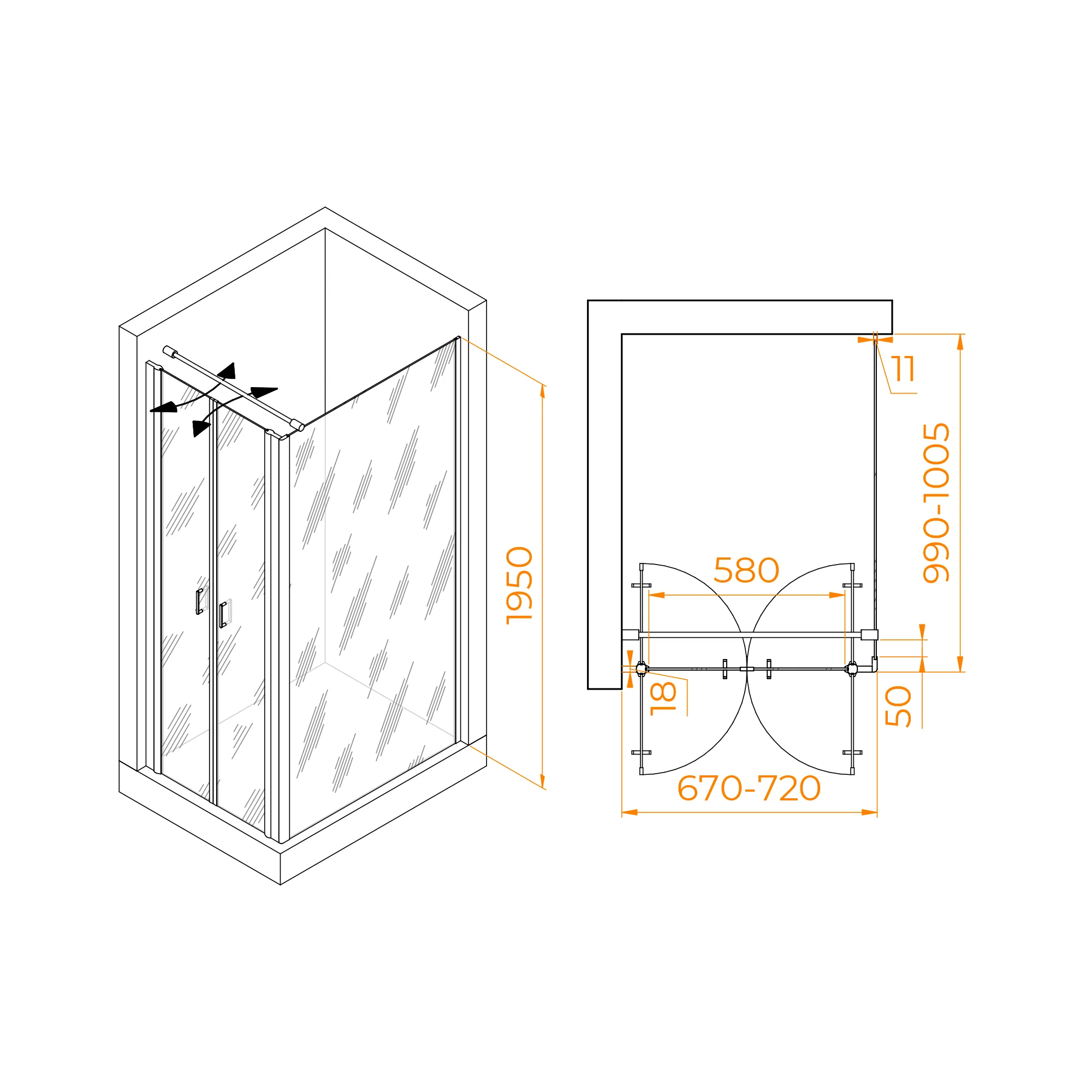 Высота душевого угла составляет 1950 мм, что делает его идеальным выбором для разных типов помещений. Независимо от высоты потолка, этот душевой угол легко вписывается в обстановку вашей ванной комнаты.