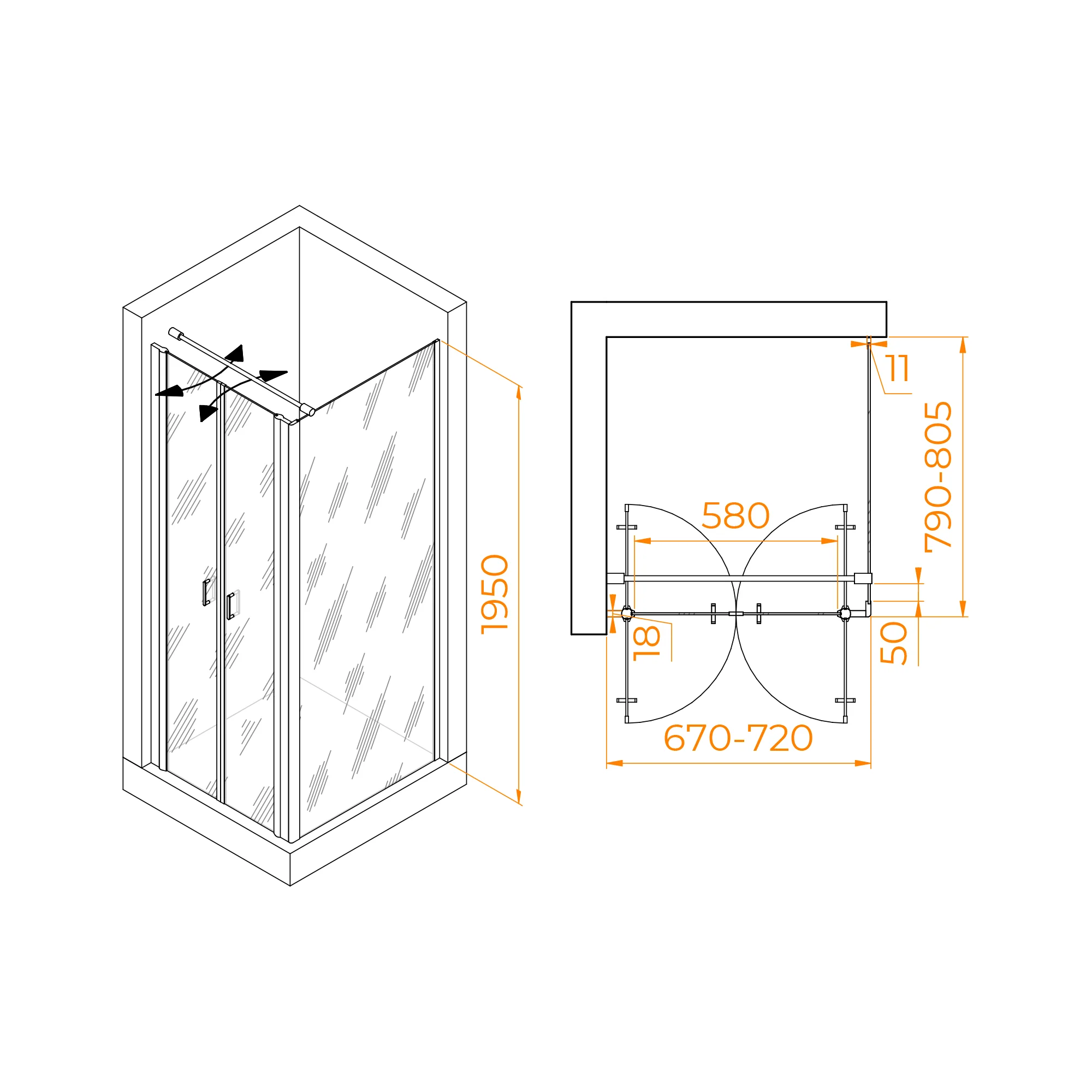 Высота душевого угла составляет 1950 мм, что делает его идеальным выбором для разных типов помещений. Независимо от высоты потолка, этот душевой угол легко вписывается в обстановку вашей ванной комнаты.