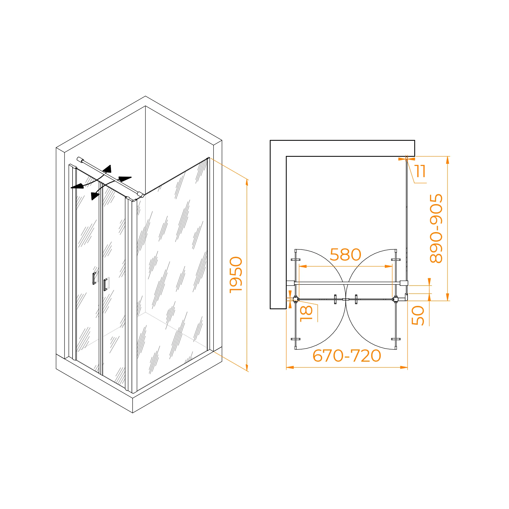 Высота душевого угла составляет 1950 мм, что делает его идеальным выбором для разных типов помещений. Независимо от высоты потолка, этот душевой угол легко вписывается в обстановку вашей ванной комнаты.