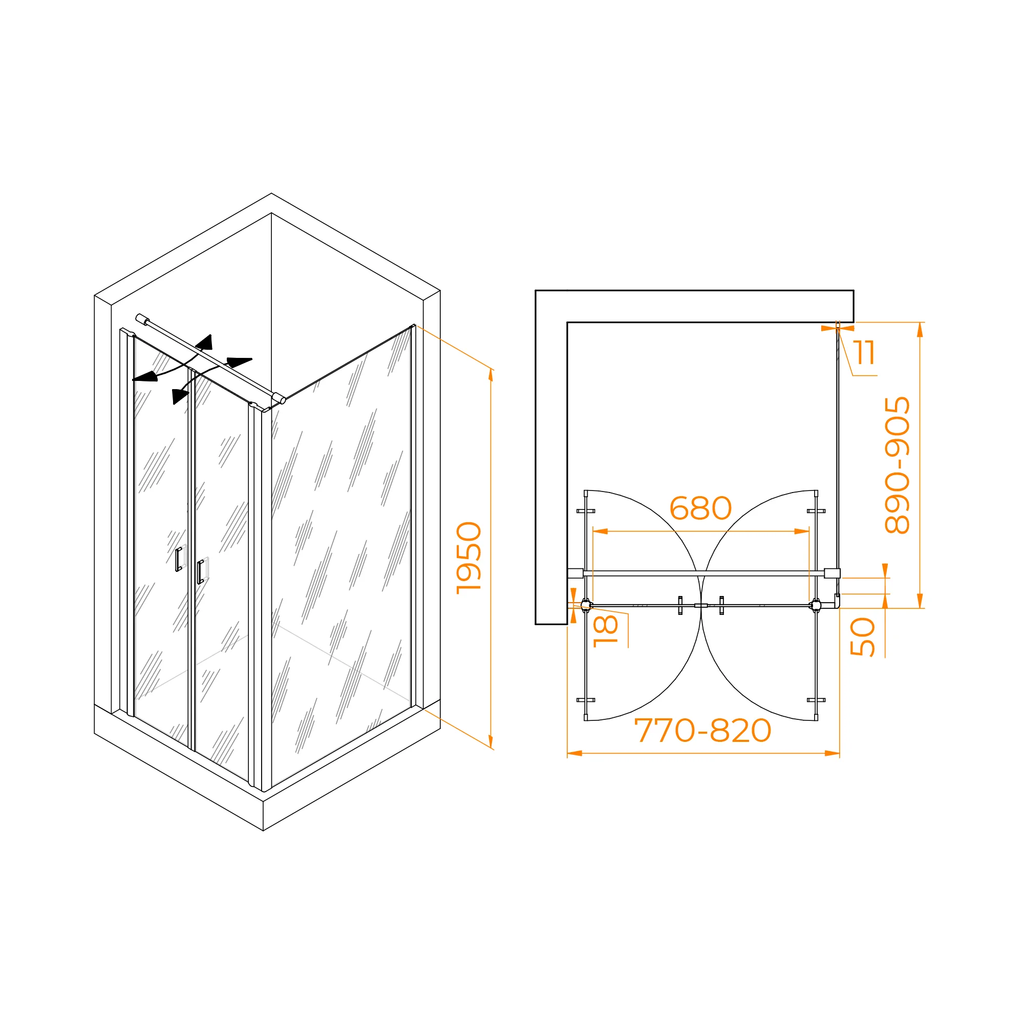 Высота душевого угла составляет 1950 мм, что делает его идеальным выбором для разных типов помещений. Независимо от высоты потолка, этот душевой угол легко вписывается в обстановку вашей ванной комнаты.