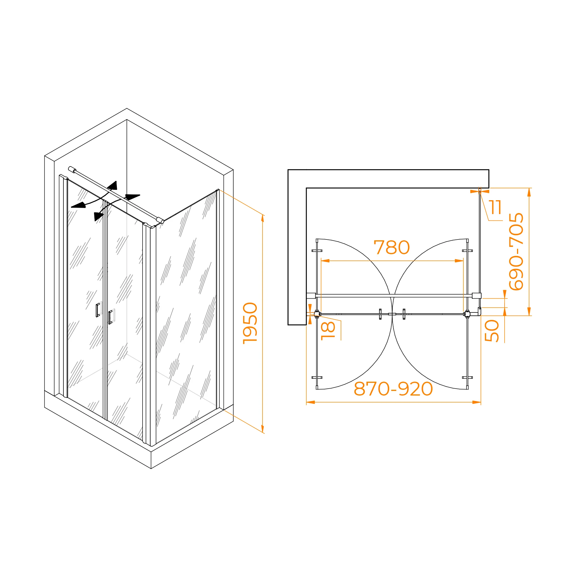 Высота душевого угла составляет 1950 мм, что делает его идеальным выбором для разных типов помещений. Независимо от высоты потолка, этот душевой угол легко вписывается в обстановку вашей ванной комнаты.