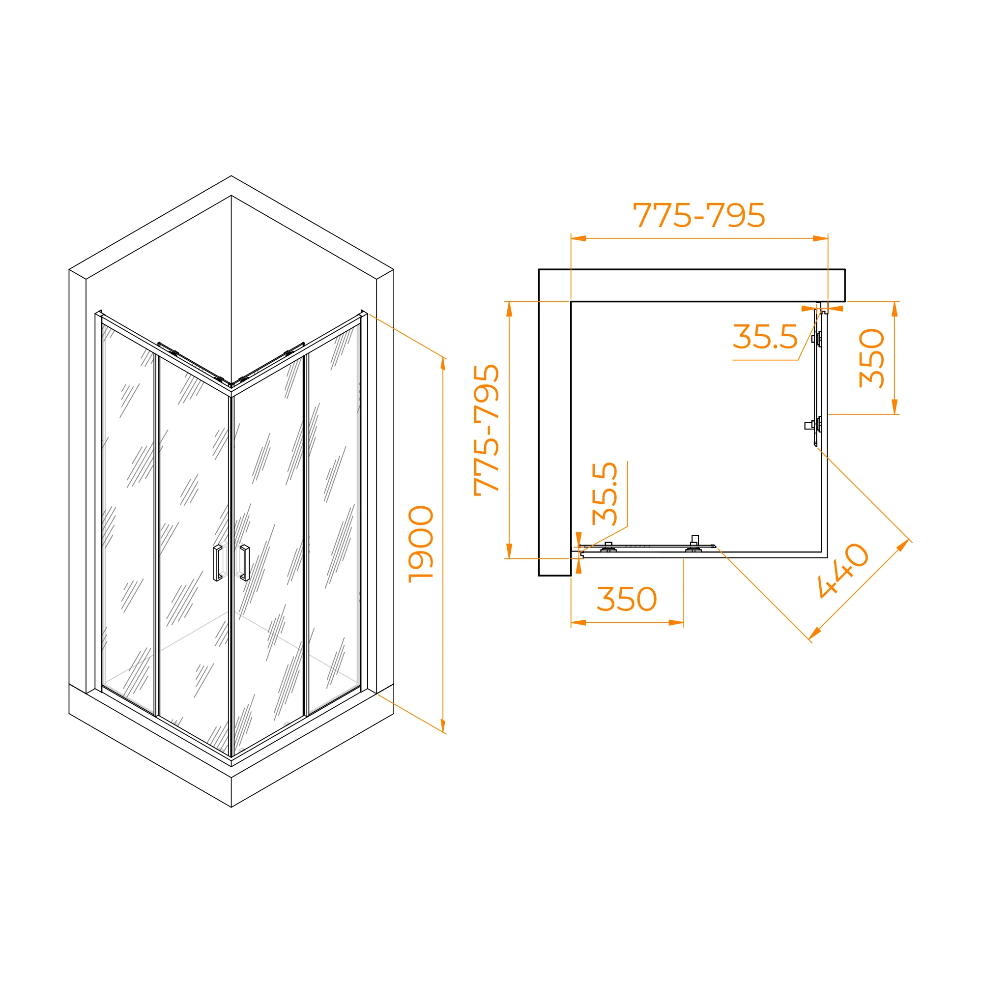 Высота душевого угла составляет 1900 мм, что дает достаточное пространство для комфортного использования. Двойные регулируемые ролики облегчают раздвижение дверей и обеспечивают бесшумную работу, что позволяет максимально расслабиться во время душа.