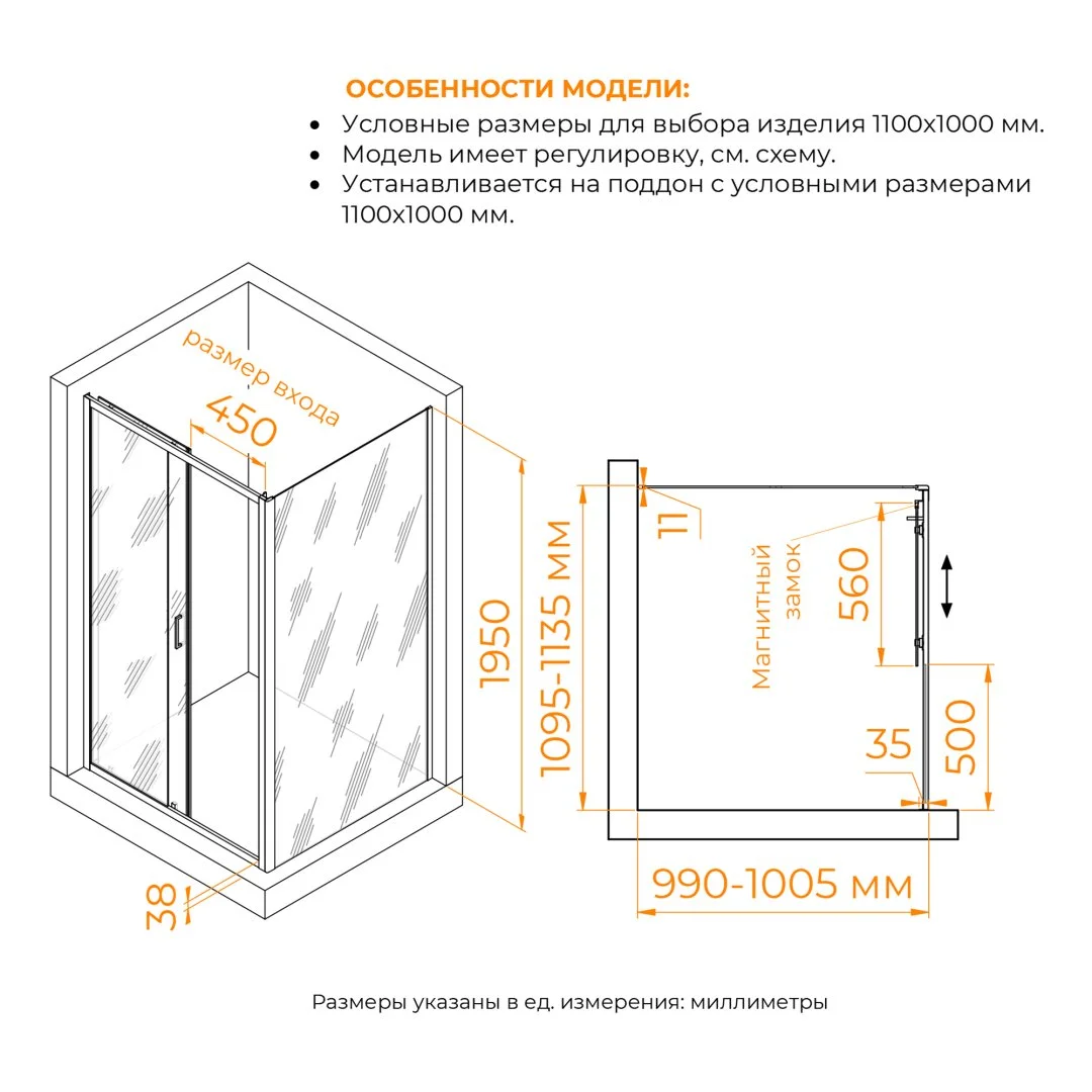 Высота душевого угла составляет 1950 мм, что позволяет вам чувствовать себя комфортно и свободно внутри него. Конструкция дверей раздвижная, обеспечивая плавное и легкое открывание и закрывание. Это особенно удобно в тех случаях, когда ванная комната имеет ограниченное пространство.
