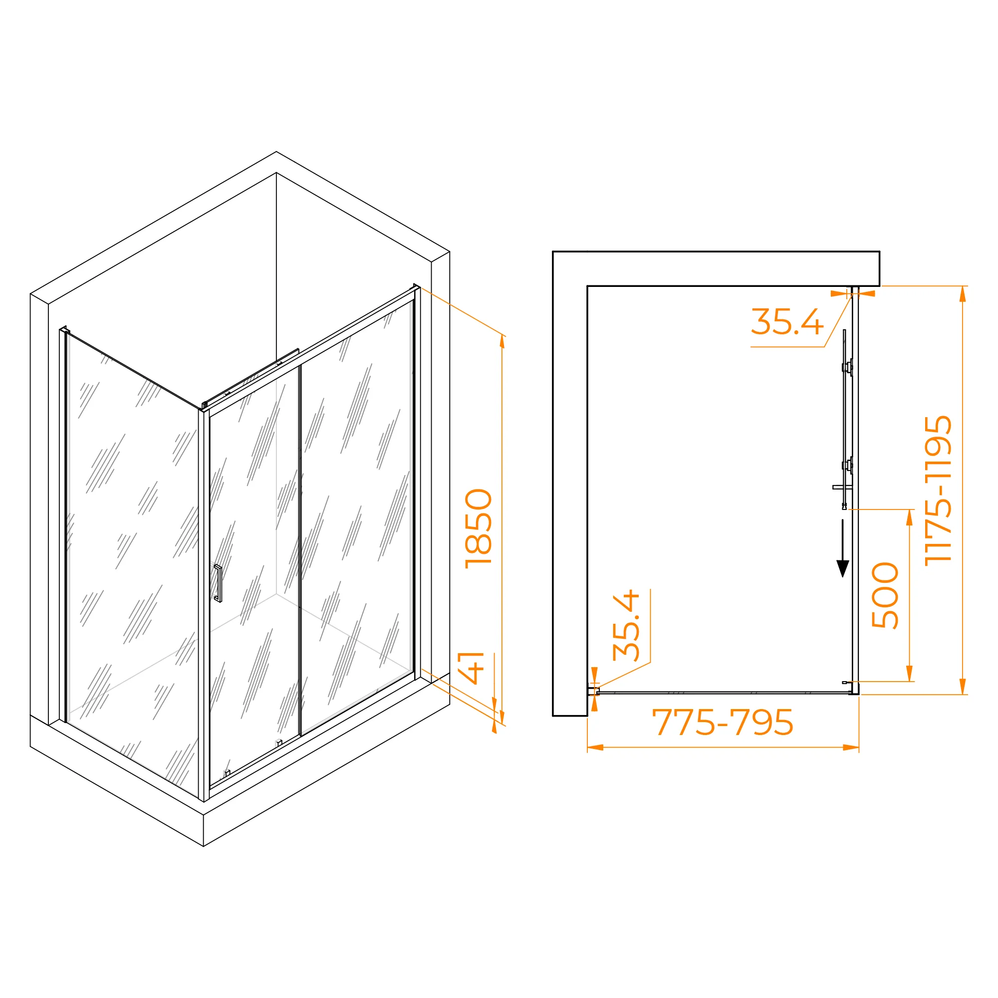 Душевой уголок имеет прямоугольную форму, которая позволяет эффективно использовать пространство в ванной комнате. Высота душевого угла составляет 1850 мм, что обеспечивает комфортное пребывание внутри него.